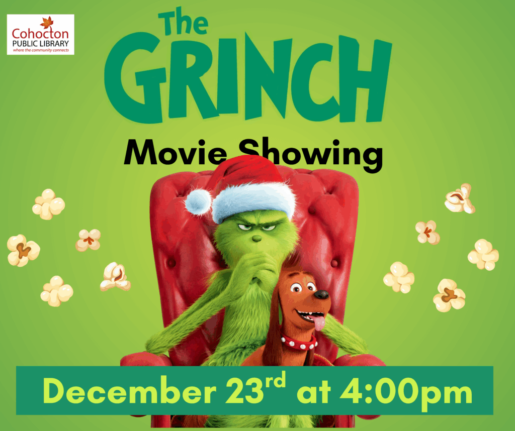 The Grinch Movie Showing- December 23rd at 4:00 pm: Snuggle up for a festive favorite! Pajamas, holiday spirit and cozy vibes encouraged!