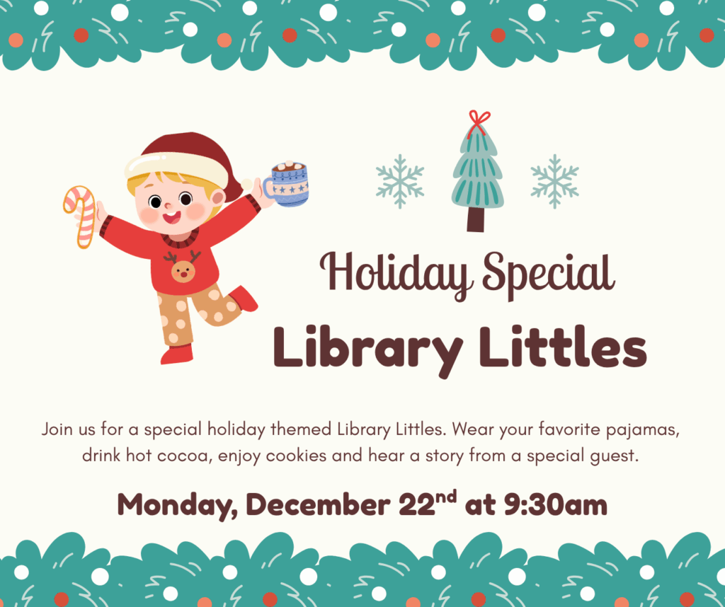 Holiday Special- Library Littles- December 22nd at 9:30am: Join us for a special holiday themed Library Littles. Wear your favorite pajamas, drink hot chocolate, enjoy cookies and hear a story from a special guest.
