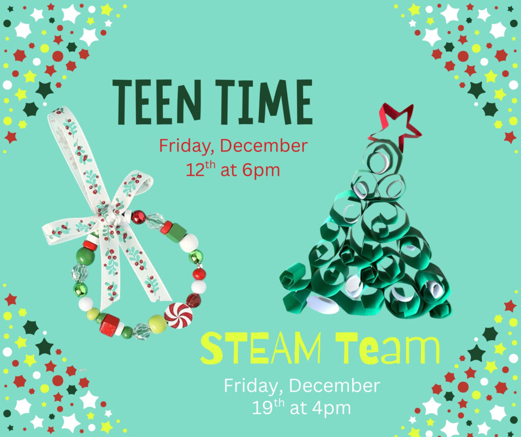 Teen Time – Friday, December 12th at 6:00 pm: Stop in for cocoa, friends and a beaded ornament workshop.