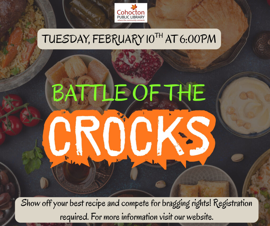 Battle of the Crocks- February 10th at 6:00pm: Calling all foodies, chefs, and home cooks! Got a favorite recipe you’re proud of? Bring your best dish to our Battle of the Crocks! Enjoy a delicious taste‑testing party, sample everyone’s creations, and vote for the crowd favorite. Please call to register.