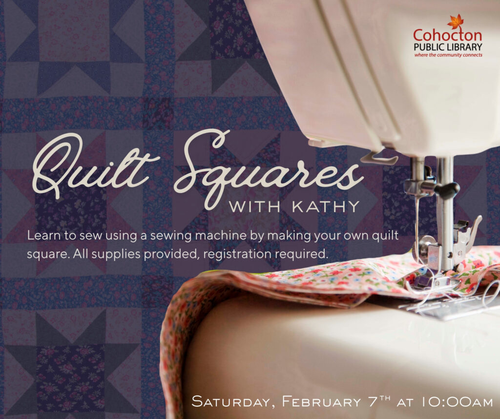Quilt Squares with Kathy- RESCHEDULED for February 28th at 10:00am: Join us for a beginner-friendly sewing class. Learn sewing machine basics with an introductory project. Local quilter Kathy Krivitza will walk us through sewing a quilt square that can be used for a variety of projects. All materials proved, free program. Please call to register.