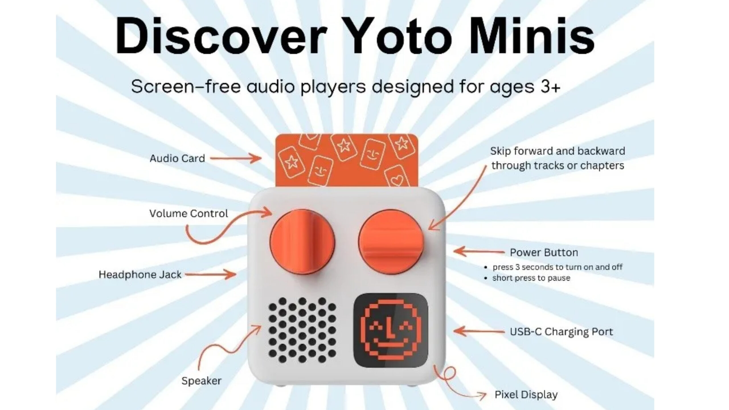 With stories, music, and learning on the go, this screen-free audio player is perfect for little hands and big adventures. Just pop in a Yoto card and take the magic anywhere!